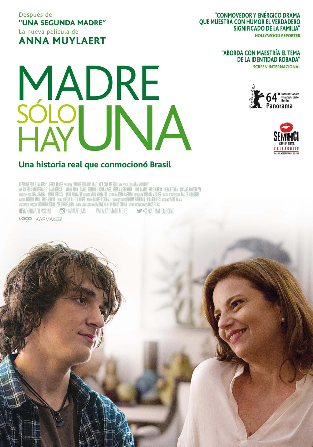 Madre sólo hay una SinopsisComentarioRepartoFicha técnicaFotosTráiler Madre sólo hay una(Mãe só há uma)Dirigida por Anna Muylaert ¿Qué te parece la película?GenialMuy buenaEntretenidaInteresanteMediocreUn rolloVotar Ver resultados Cartel de la película Madre sólo hay una. Póster en alta definición Ampliar