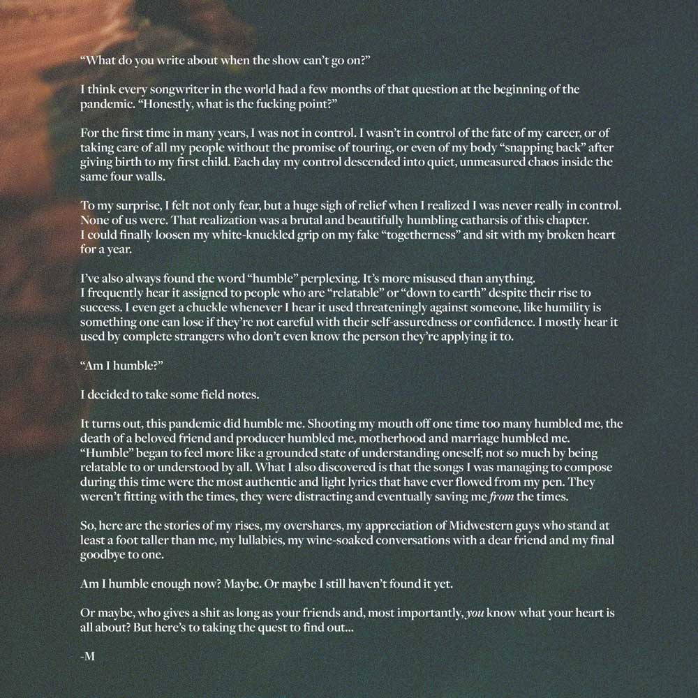 "Resulta que la pandemia me humilló. Dispararme a la boca una vez me humilló, la muerte de un querido amigo y productor me humilló, la maternidad y el matrimonio me humillaron. 'Humilde' comenzó a sentirse más como un estado arraigado de comprensión de uno mismo; no tanto por ser identificable o entendido por todos. Lo que también descubrí es que las canciones que estaba logrando componer durante este tiempo eran las letras más auténticas y ligeras que jamás hayan brotado de mi pluma. No encajaban con los tiempos, me distraían y eventualmente me salvaban de los tiempos. Así que aquí están las historias de mis ascensos, mis acciones en exceso, mi aprecio por los chicos del medio oeste que son al menos un pie más altos que yo, mis canciones de cuna, mis conversaciones empapadas de vino con un querido amigo y mi último adiós a uno".