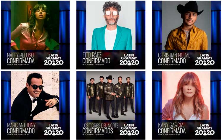 Se han anunciado las primeras actuaciones para los Grammy Latinos 2020 cuyos ganadores se anunciarán el 19 de noviembre. Una fiesta con Marc Anthony, Bad Bunny, Pedro Capó, Alejandro Fernández, Karol G, Kany García, Los Tigres del Norte, Christian Nodal, Nathy Peluso y Fito Páez. Con presentación de Carlos Rivera y Roselyn Sánchez.