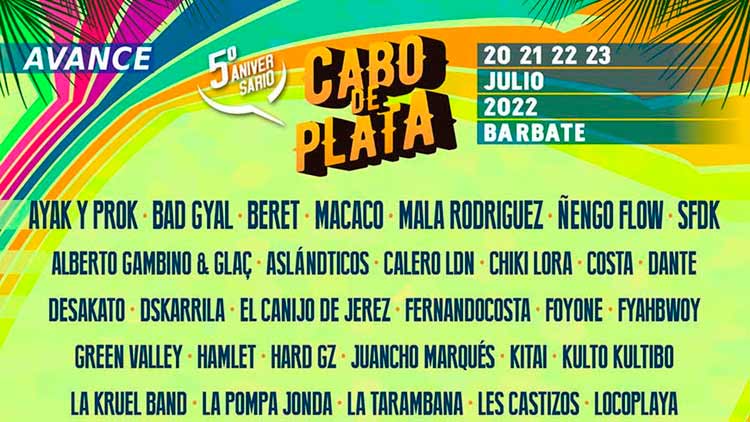 El Festival Cabo de Plata en su edición quinto aniversario, se celebrará del 20 al 23 de julio de 2022 en la playa gaditana de la Hierbabuena en Barbate, con el siguiente cartel.