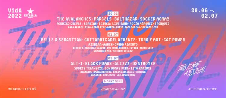Comentamos el cartel del Vida Festival 2022, que se celebrará entre el 30 de junio y el 2 de julio en Villanueva y Geltrú (Barcelona), con The avalanches, Parcels, Balthazar, Soccer Mommy, Belle & Sebastian, Guitarricadelafuente, Toro y Moi, Cat Power, Alt-J, Black Pumas, Alizzz y Destroyer como nombres más destacados en el mismo. Además Rodrigo Cuevas, Barbián, Baiuca: Live band, Rocío Márquez + Bronquio, Mishima, Maren, Crudo Pimento, Sports Team, Boye, Son Rompe Pera y Tito Ramírez, entre otros. También se confirma a Rhye, Lewis Ofman, Israel Fernández y Diego del Morao, Pau Riba y Delaporte.