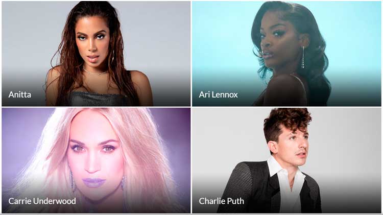 Con Anitta, Carrie Underwood, Charlie Puth, David Guetta con Bebe Rexha, Imagine Dragons, Lil Baby, P!nk y Stevie Wonder entre otros